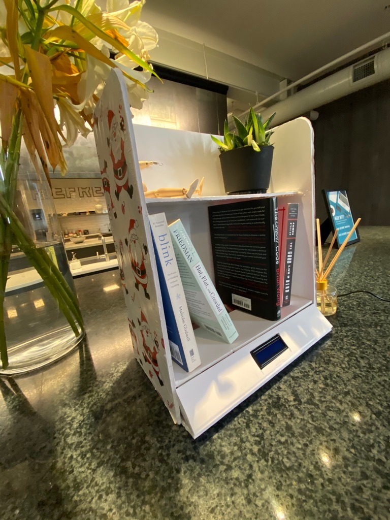 Our team decided to make an ambient bookcase that is connected to other devices, the same bookcase. Once one side of the user picks a book to read from the bookcase, the other side of the device displays the same title and quote. Two devices are connected in distance and help two or many parties to feel more connected to each other by reading the same books because they have something in common to share together.